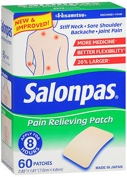 For the temporary relief of minor aches & pains of muscles & joints associated with: arthritis, simple backache, strains, bruises, sprains. This product is not made with natural rubber latex. Apply for 8 hours. 2.83 x 1.81 inches.