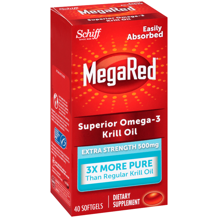 Contains oil from 100% pure Antarctic krill, tiny crustaceans that throve in the frigid waters of the Antarctic. Just one small softgel provides an optimal combination of omega-3 fatty acids and the powerful antioxidant astaxanthin to support heart health.* Research has shown that omega-3s may reduce the risk of coronary heart disease.+ In order for omega-3s to be put to good use, they must first be absorbed by your body. Traditional fish oil floats on top of your stomach, giving that unpleasant fishy aftertaste. MegaRed Omega-3 Krill Oil is different. Its omega-3s are carried in phospholipid form, so it: Easily mixes in the stomach and doesn't leave an unpleased aftertaste; is easily recognized and utilized by your body's cell membranes, which are also phospholipid, allowing easy absorption. Gelatin is derived from bovine sources. Guaranteed: no added sugar (sucrose, fructose, lactose), salt (sodium chloride), yeast, wheat, gluten, or milk. No preservatives or artificial colors. Guaranteed for purity, freshness and labeled potency. *These statements have not been evaluated by the Food and Drug Administration. This product is not intended to diagnose, treat, cure or prevent any disease. +Supportive, but not conclusive research shows that consumption of EPA and DHA Omega-3 fatty acids may reduce the risk of coronary heart disease.