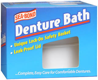 1. Put cleanser and dentures into the safety basket inside the denture bath. 2. Add enough very warm (not hot) water to cover dentures. Close lid firmly. 3. After soaking, lift out basket. Simply mount basket on inside bath hinge. 4. Rinse dentures under warm, running water. You may leave your dentures in basket while rinsing. 5. If dentures are still stained after soaking, brush with Sea-Bond Brightening Cleanser, designed to brighten away tough, hard-to-reach denture stains. 6. Rinse out and dry denture bath and basket. Replace basket into denture bath. Press firmly to lock lid in place. 7. Top rack dishwasher safe.