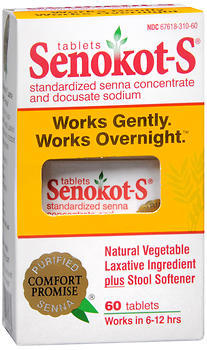Relieves occasional constipation (irregularity). Generally produces a bowel movement in 6-12 hours. Natural vegetable laxative ingredient plus stool softener. For your comfort, the active ingredient in Senokot-S Laxatives is always purified senna, manufactured to high quality standards. Very low sodium.