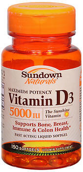Vitamin D3 is an essential nutrient that works with calcium to help develop strong bones and teeth.* This super-potency vitamin D supplement also assists in maintaining breast health and supports a healthy antibody response.* An analysis of 5 studies concluded that increasing vitamin D intake up to 2000 IU per day could promote colon health.* Recent evidence also indicates that increasing vitamin D intake can support the health of the pancreas.* Supplementing with Sundown Naturals Maximum Potency Vitamin D3 is an easy and convenient way to increase your daily vitamin D intake. No artificial color, flavor or sweetener, preservatives, sugar, starch, milk, lactose, gluten, wheat, yeast, fish. Sodium free. *These statements have not been evaluated by the Food and Drug Administration. This product is not intended to diagnose, treat, cure or prevent any disease.