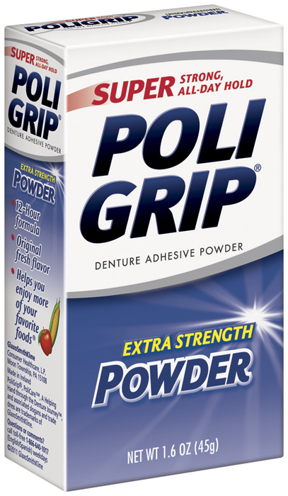 Get the confidence you need with the strong, all-day hold of SUPER POLIGRIP EXTRA STRENGTH POWDER. Helps hold dentures tight for up to 12 full hours. Makes your dentures feel comfortable and natural in your mouth. Forms a seal to help keep food from getting stuck between your dentures and gums. Has an easy-to-use, convenient bottle. Original fresh flavor.