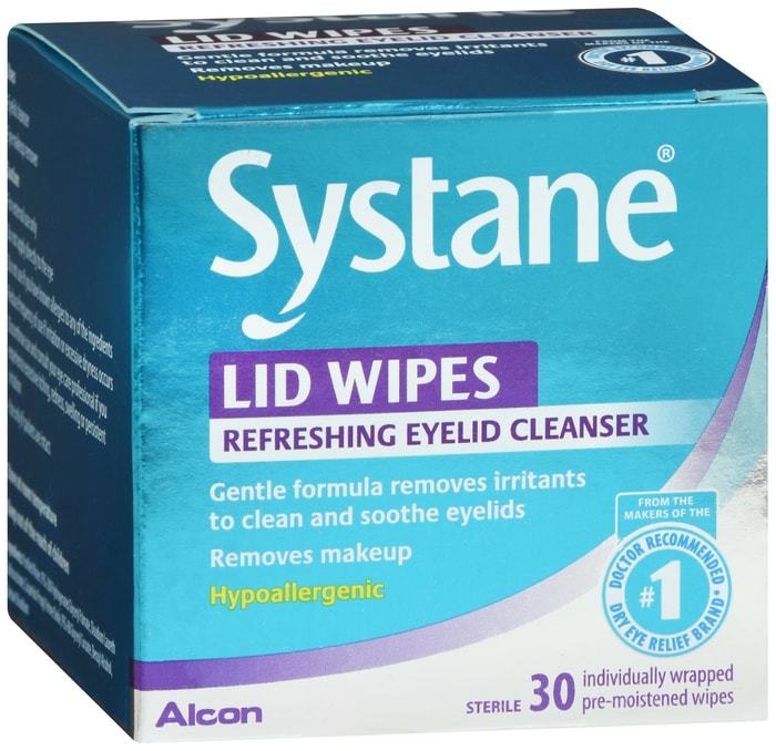 Eyelid cleanser, eye makeup remover. This product offers a gentle cleansing wipe as part of a daily regimen recommended by eye care professionals. These premium pre-moistened wipes remove debris, makeup and irritants that can cause eye irritation to comfort and soothe eyelids. Hypoallergenic, non-irritating and individually wrapped for convenience.