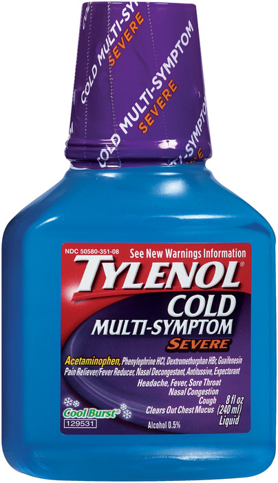 Liver warning: This product contains acetaminophen. Severe liver damage may occur if you take: more than 12 tablespoons in 24 hours, which is the maximum daily amount; with other drugs containing acetaminophen; 3 or more alcoholic drinks every day while using this product. Sore throat warning: If sore throat is severe, persists for more than 2 days, is accompanied or followed by fever, headache, rash, nausea or vomiting, consult a doctor promptly. Do not use: with any other product containing acetaminophen (prescription or nonprescription). If you are not sure whether a drug contains acetaminophen, ask a doctor or pharmacist; if you are now taking a prescription monoamine oxidase inhibitor (MAOI) (certain drugs for depression, psychiatric or emotional conditions, or Parkinson's disease), or for 2 weeks after stopping the MAOI drug. If you do not know if your prescription drug contains an MAOI, ask a doctor or pharmacist before taking this product; if you have ever had an allergic reaction to this product or any of its ingredients. Ask a doctor before use if you have: liver disease; heart disease; high blood pressure; thyroid disease; diabetes; trouble urinating due to an enlarged prostate gland; persistent or chronic cough such as occurs with smoking, asthma, or emphysema; cough that occurs with too much phlegm (mucus). Ask a doctor or pharmacist before use if you are taking the blood thinning drug warfarin. When using this product do not exceed recommended dosage. Stop use and ask a doctor if: nervousness, dizziness or sleeplessness occurs; pain, nasal congestion or cough gets worse or lasts for more than 7 days; fever gets worse or lasts for more than 3 days; redness or swelling is present; new symptoms occur; cough comes back or occurs with rash or headache that lasts. These could be signs of a serious condition. If pregnant or breast-feeding, ask a health professional before use. Keep out of reach of children. Overdose warning: Taking more than the recommended dose (overdose) may cause liver damage. In case of overdose, get medical help or contact a Poison Control Center right away. (1-800-222-1222) Quick medical attention is critical for adults as well as for children even if you do not notice any signs or symptoms.