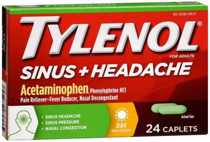 Liver warning: This product contains acetaminophen. The maximum daily dose of this product is 10 caplets (3,250 mg acetaminophen) in 24 hours. Severe liver damage may occur if you take: more than 4,000 mg of acetaminophen in 24 hours; with other drugs containing acetaminophen; 3 or more alcoholic drinks every day while using this product. Allergy alert: acetaminophen may cause severe skin reactions. Symptoms may include: skin reddening; blisters; rash. If a skin reaction occurs, stop use and seek medical help right away. Do not use: with any other drug containing acetaminophen (prescription or nonprescription). If you are not sure whether a drug contains acetaminophen, ask a doctor or pharmacist; if you are now taking a prescription monoamine oxidase inhibitor (MAOI) (certain drugs for depression, psychiatric or emotional conditions, or Parkinson's disease), or for 2 weeks after stopping the MAOI drug. If you do not know if your prescription drug contains an MAOI, ask a doctor or pharmacist before taking this product; if you have ever had an allergic reaction to this product or any of its ingredients. Ask a doctor before use if you have: liver disease; heart disease; high blood pressure; thyroid disease; diabetes; trouble urinating due to an enlarged prostate gland. Ask a doctor or pharmacist before use if you are taking the blood thinning drug warfarin. When using this product do not exceed recommended dose. Stop use and ask a doctor if: nervousness, dizziness, or sleeplessness occur; pain or nasal congestion gets worse or lasts more than 7 days; fever gets worse or lasts more than 3 days; redness or swelling is present; new symptoms occur. These could be signs of a serious condition. If pregnant or breast-feeding, ask a health professional before use. Keep out of reach of children. Overdose warning: In case of overdose, get medical help or contact a Poison Control Center right away. (1-800-222-1222) Quick medical attention is critical for adults as well as for children even if you do not notice any signs or symptoms. Do not use if carton is opened or if blister unit is broken. Important: Read all product information before using. Keep this box for important information.